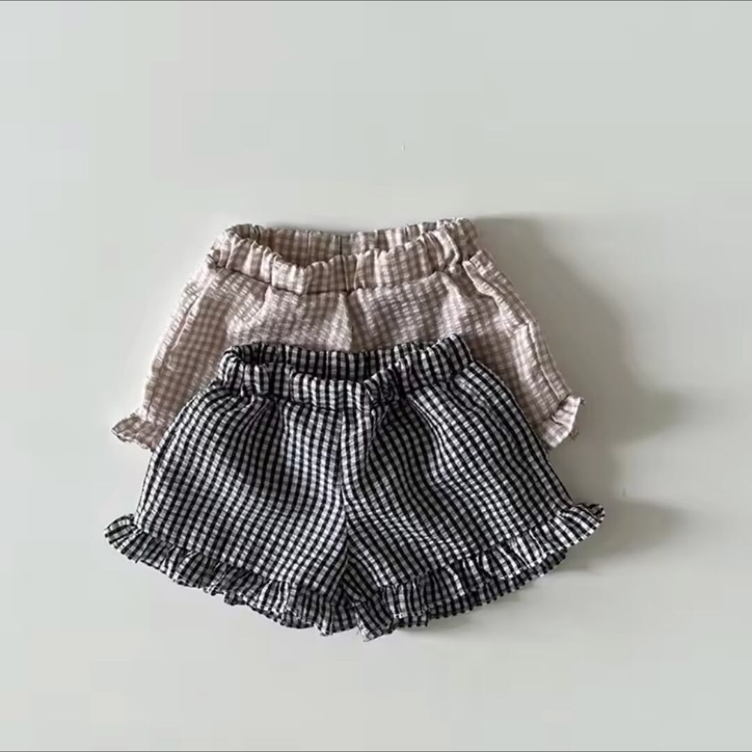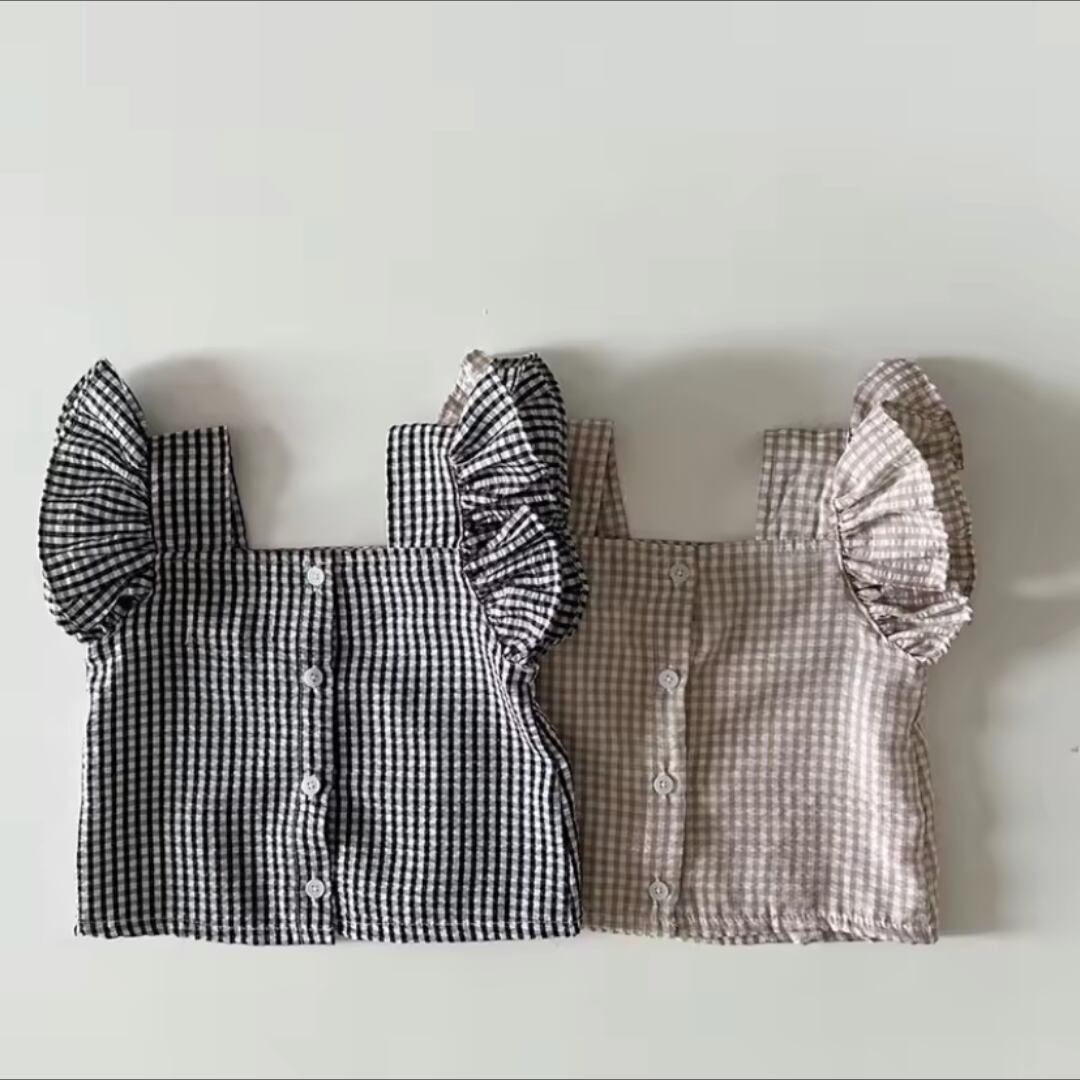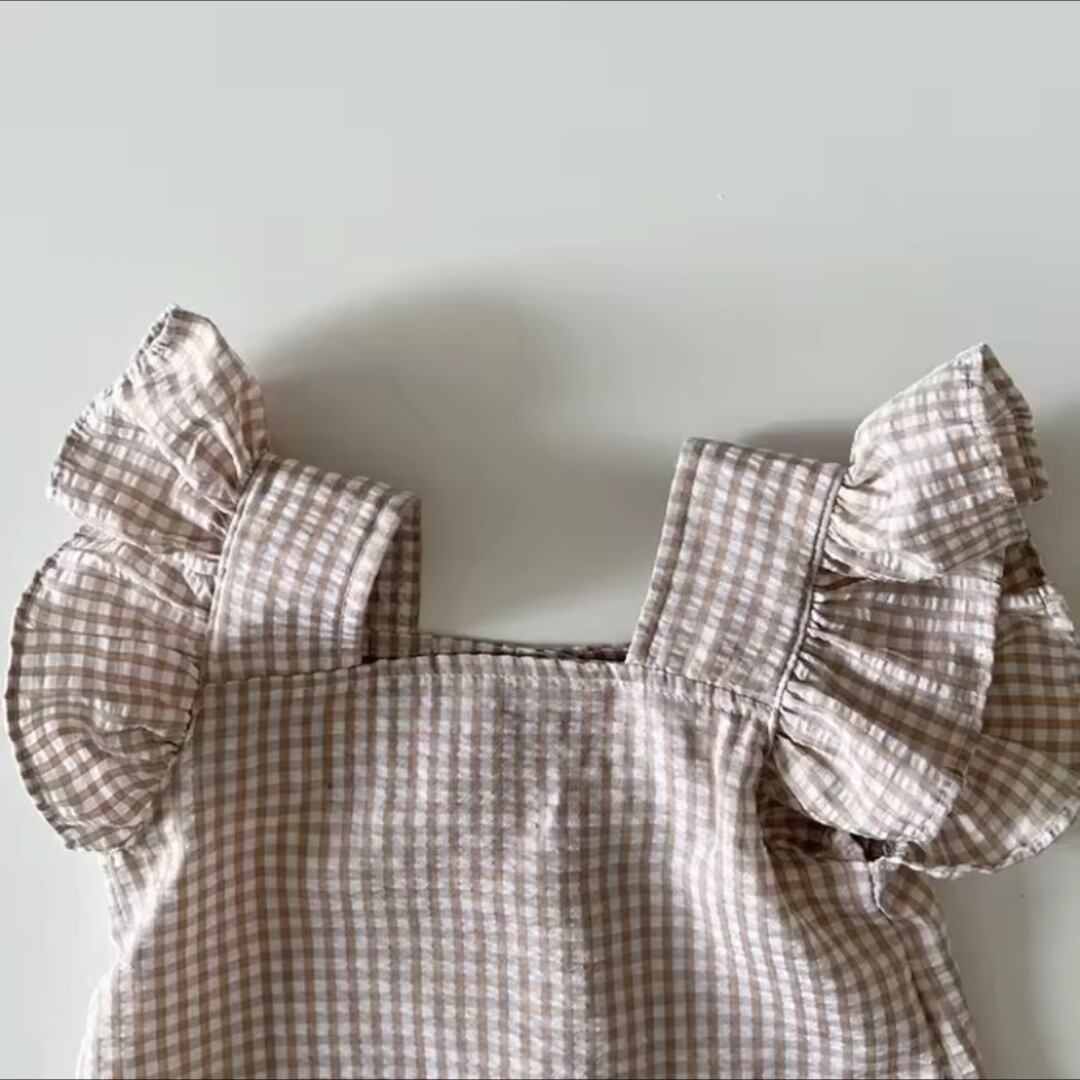 女の子春夏の韓国スタイルチェック柄フリル付きツーピースセットのご紹介です!