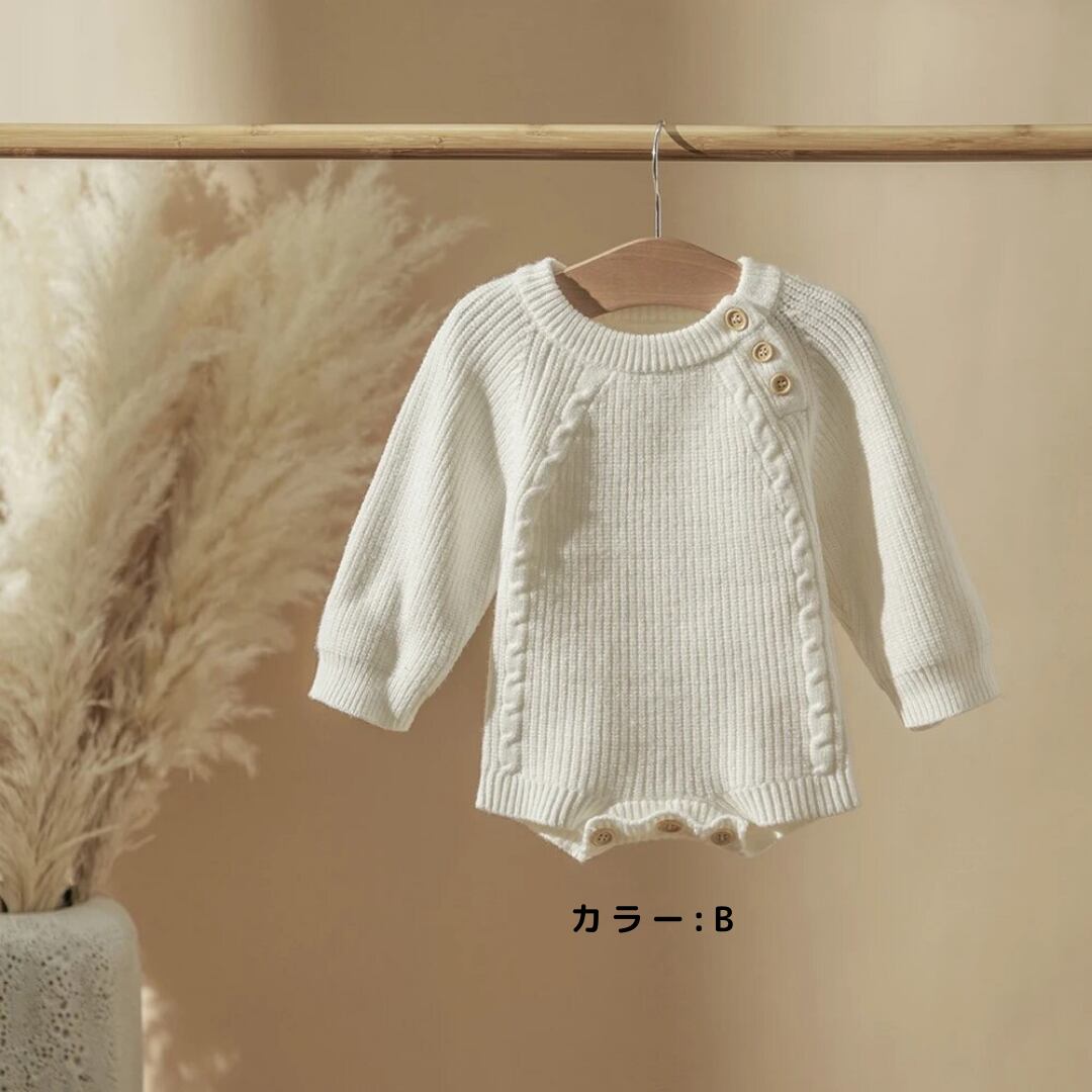 このニットロンパースは、心温まる暖かさとおしゃれさを感じさせてくれるアイテムです。