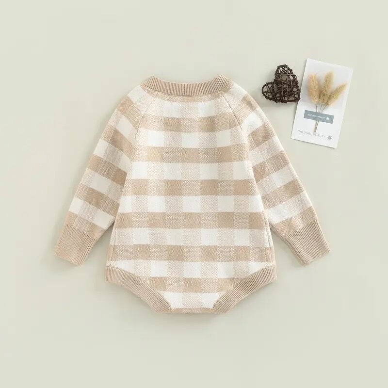 長袖チェック柄ラウンドネックプリントロンパース