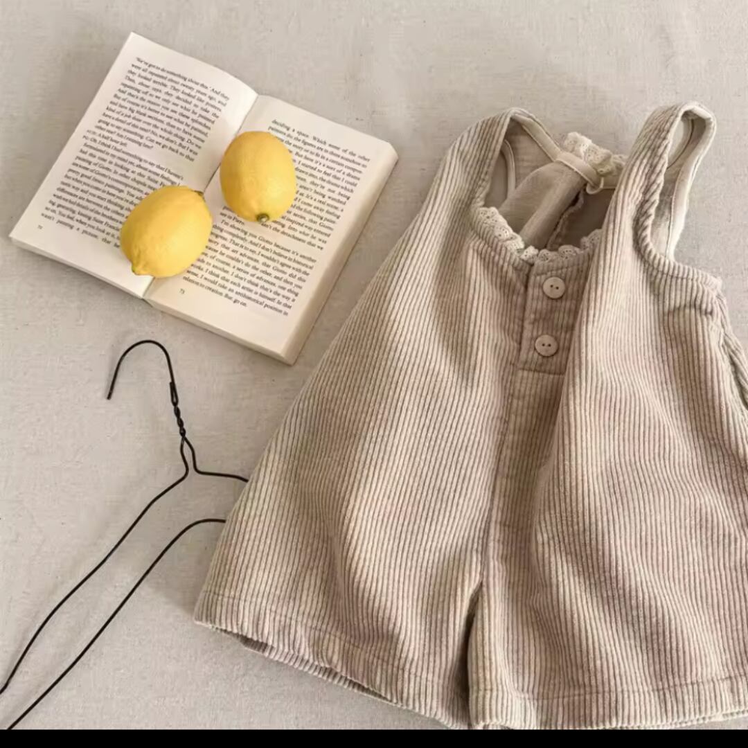 こちらのサスペンダーパンツは、愛らしいレースデザインが特徴で、コーデュロイ素材を使用しているため、肌触りも抜群です。